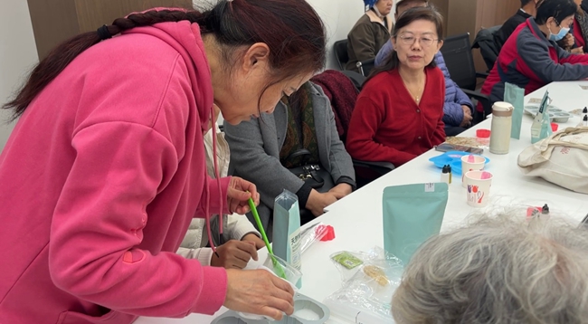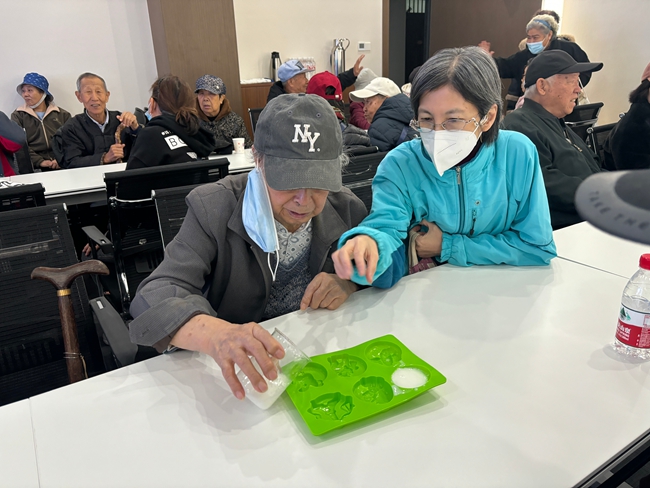 活动现场,工作人员提前备齐精油、皂液、工具及水果,活动一开始,细致的向大家讲解制作要点.经过工作人员的示范,大家跃跃欲试,制作过程中,老同志们小心加入精油,还会调色晕染,使用不同的磨具反复调整形状,追求逼真效果,大家相互分享技巧、欣赏作品,现场欢声笑语不断。