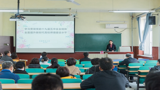 苏寄宛报告主题是《学习贯彻党的十九届五中全会精神 全面提升新时代高校师德建设水平》。她结合五中全会精神从五个方面进行了深入阐述:一谈师德是什么、二谈师德为什么、三谈师德做什么、四谈师德戒什么、五谈师德修什么。她系统梳理了国家对教育事业、教师职业的相关法律法规,重点讲解了习近平总书记关于教育的重要论述和对教师的殷切希望。最后,她建议大家从中国优秀传统文化中汲取营养,在新的时代续写新的篇章。