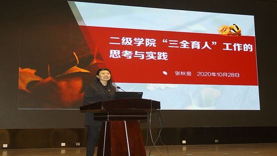 张秋曼从“三全育人”背景、学校“三全育人”方案、“三全育人”相关思考、学院工作举措等五个方面进行了诠释和案例分享,引导校区教职工深入思考,学习了解“三全育人”工作的着力点、切入点以及结合单位实际、专业特点构建特色课程思政育人体系的重要性。她强调,未来努力方向是既要营造一个良好的环境和氛围,又要在帮助学生成长的同时注重教师的提升。