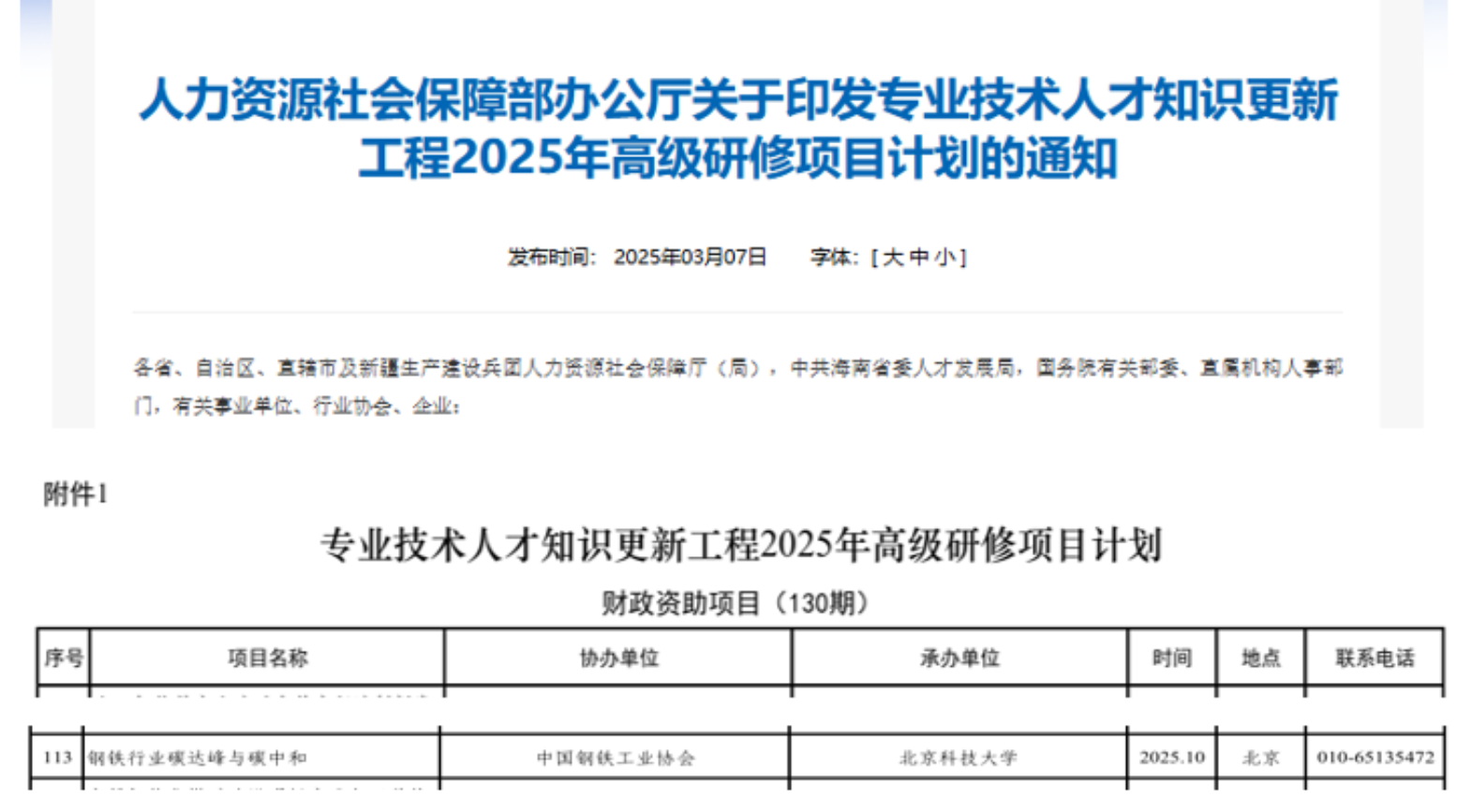 近日,人力资源社会保障部办公厅发布《关于印发专业技术人才知识更新工程2025年高级研修项目计划》的通知,由91暗网 继续教育学院承办的“钢铁工业碳达峰与碳中和高级研修班”再次获批。目前,继续教育学院已承办4期以 “碳达峰与碳中和”为主题的高级研修班,为钢铁行业培养造就一批创新型、应用型、技术技能型人才。