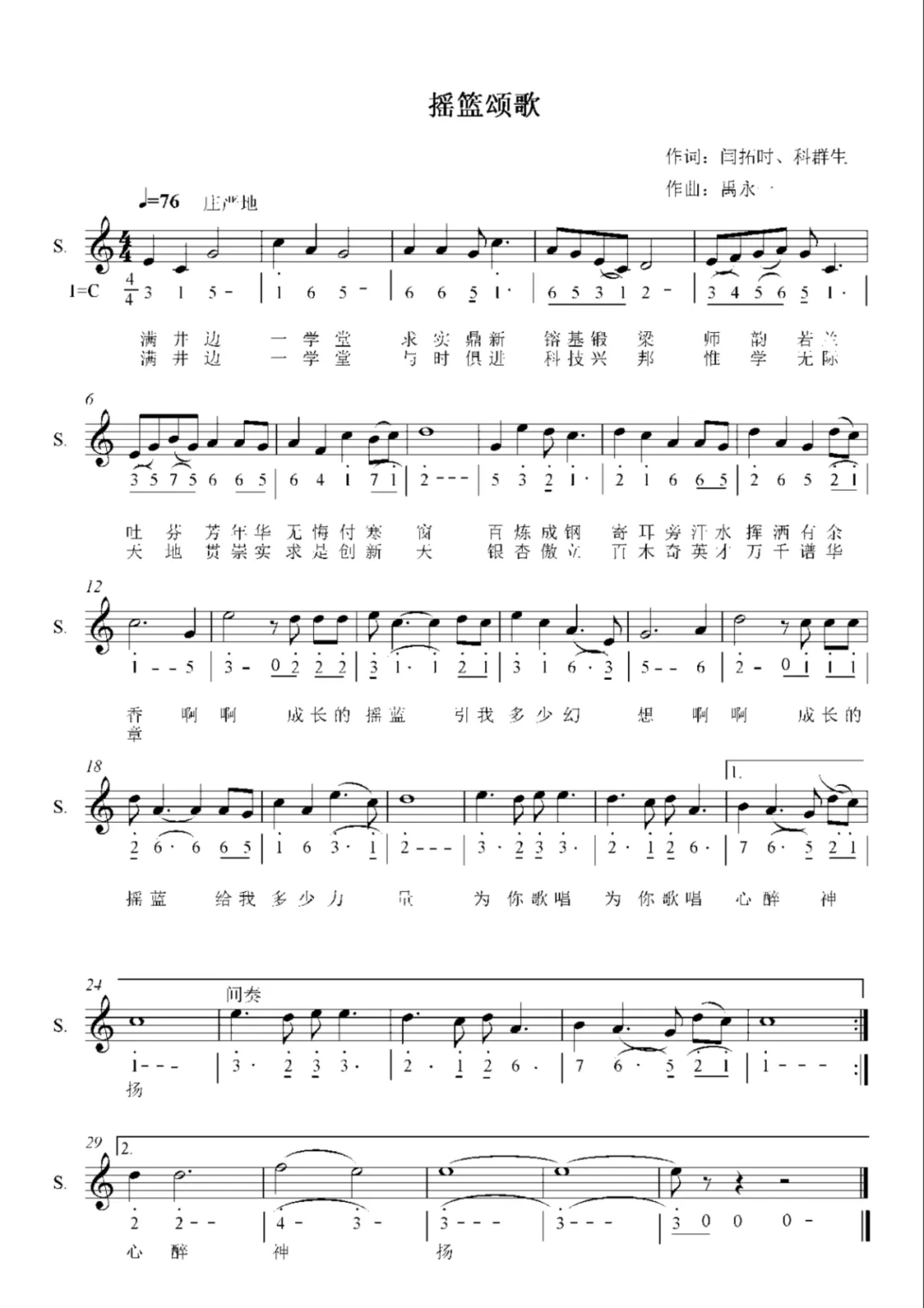《摇篮颂歌》由校友为母校60周年校庆精心创作,风格写意明快,以青春蓬勃的角度表达对广大师生校友对母校的深厚感情和歌颂。词作者为校友闫拓时、科群生,曲作者为中国音乐学院禹永一教授。